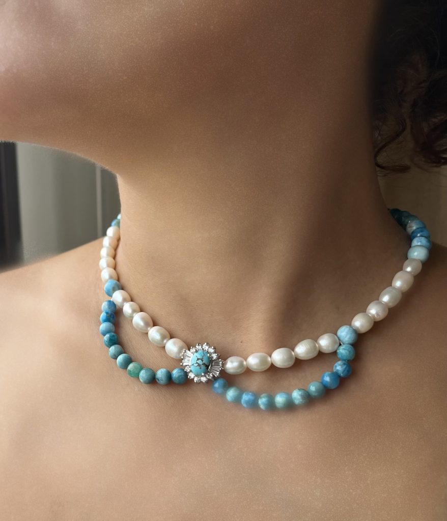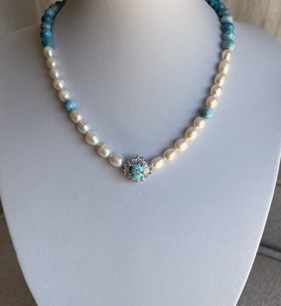 Gemstone: Turquoise Gem & Freshwater Pearls & Blue bieds