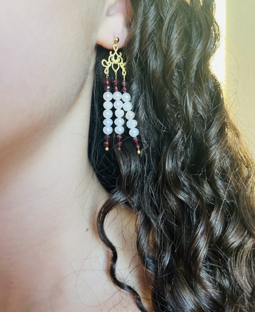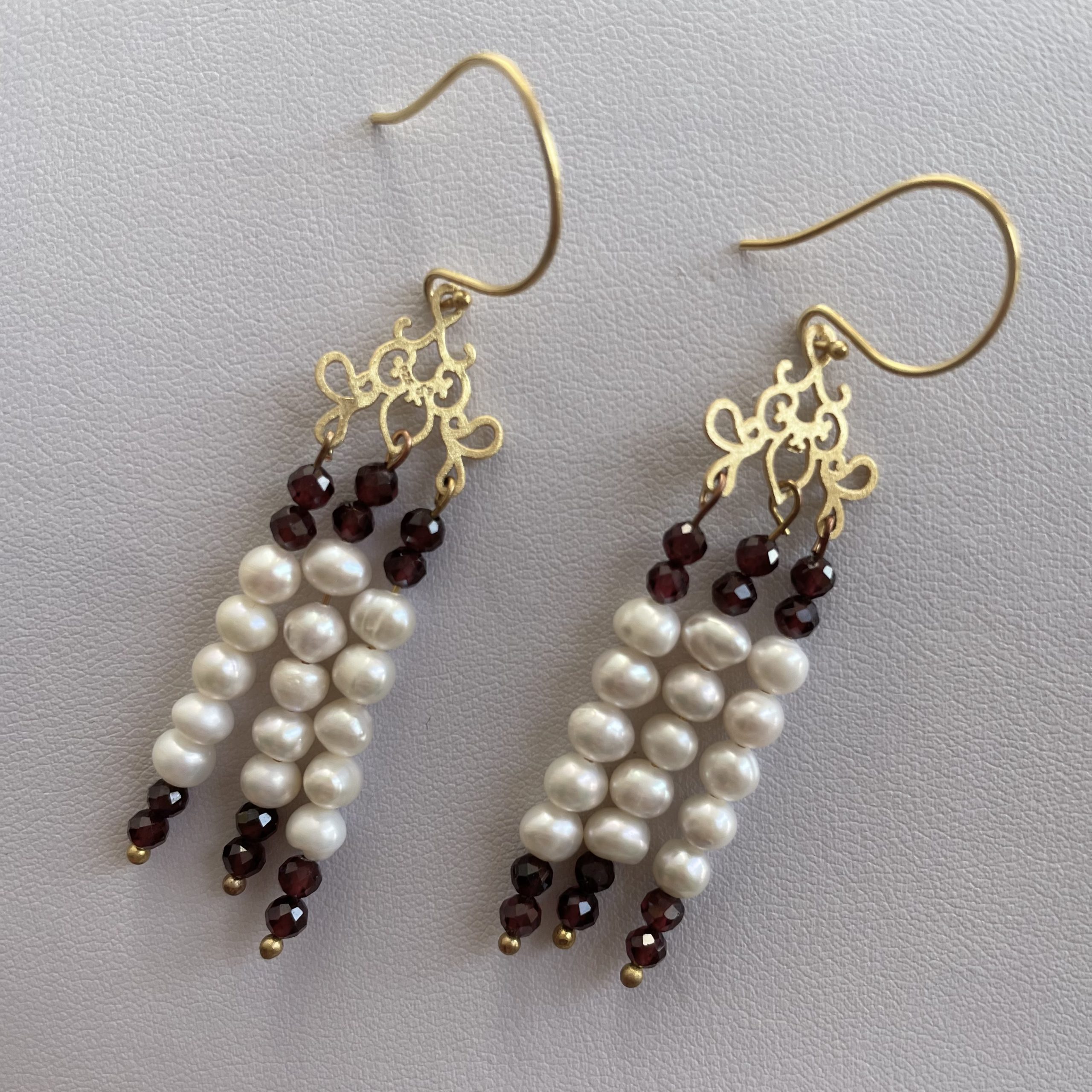 Featuring luminous freshwater pearls and deep garnet-toned beads, these cascading earrings are accented with intricate golden filigree for a look that is both regal and refined. Perfect for evening glamour or timeless sophistication.