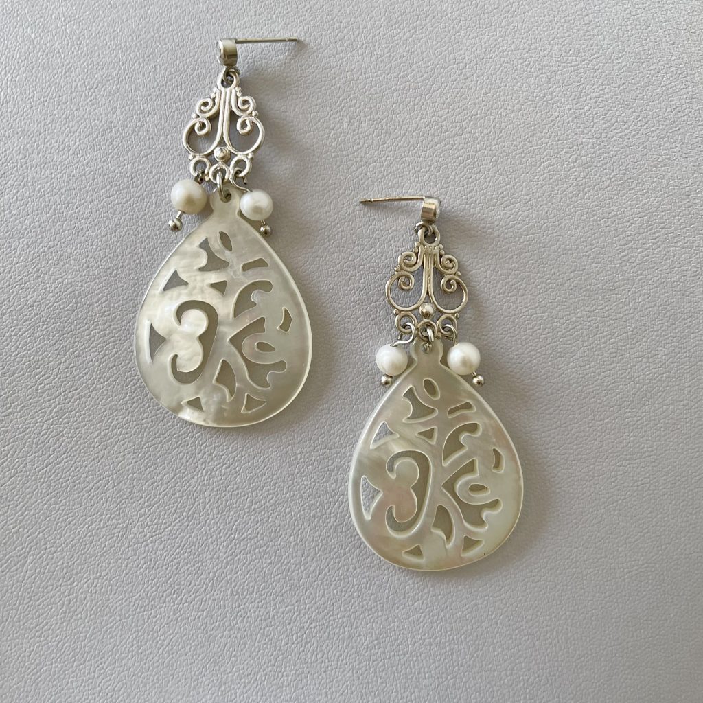 Crafted from a combination of silver and seashell, these earrings capture the light with every movement, instilling a sense of timeless elegance and subtle artistry.