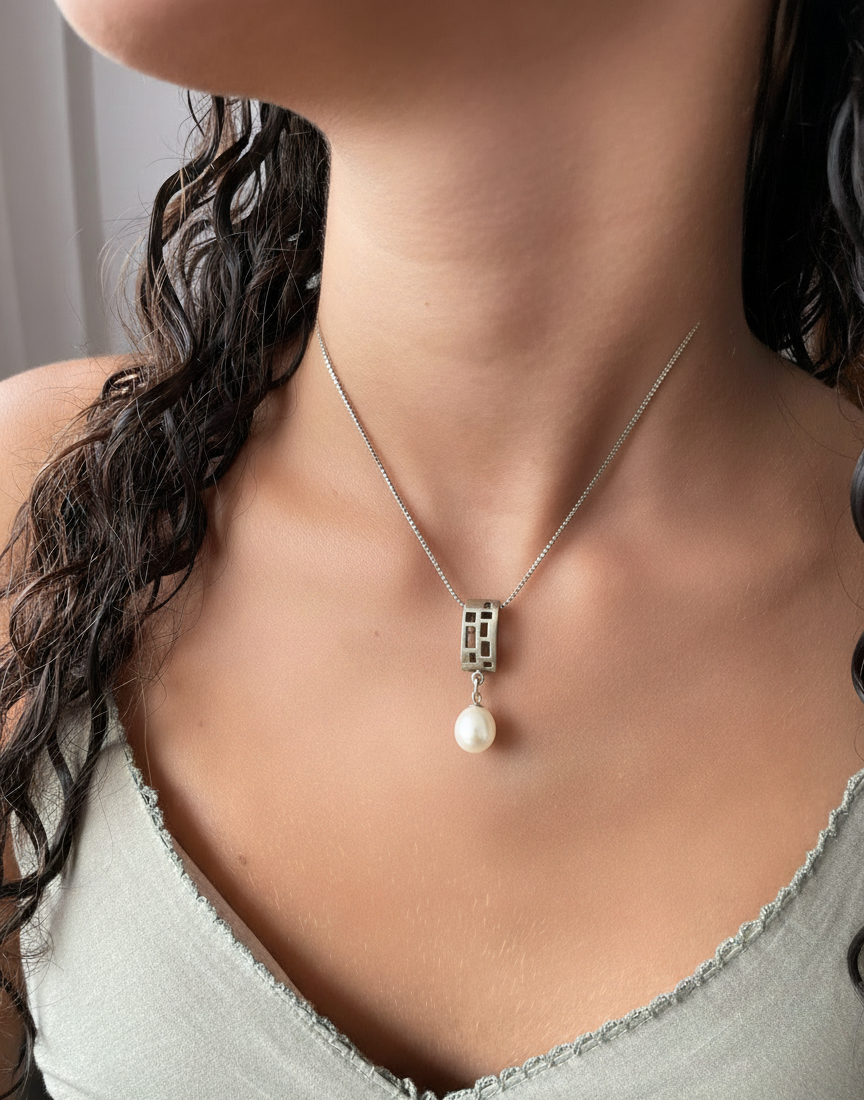Experience the allure of timeless design with our exquisite silver pendant, featuring a unique dimensional form that captures light from every angle. Designed with a dual-sided structure and a sleek chain threading through its core, this piece is completed with a natural pearl gracefully suspended at its base, adding an elegant touch of sophistication